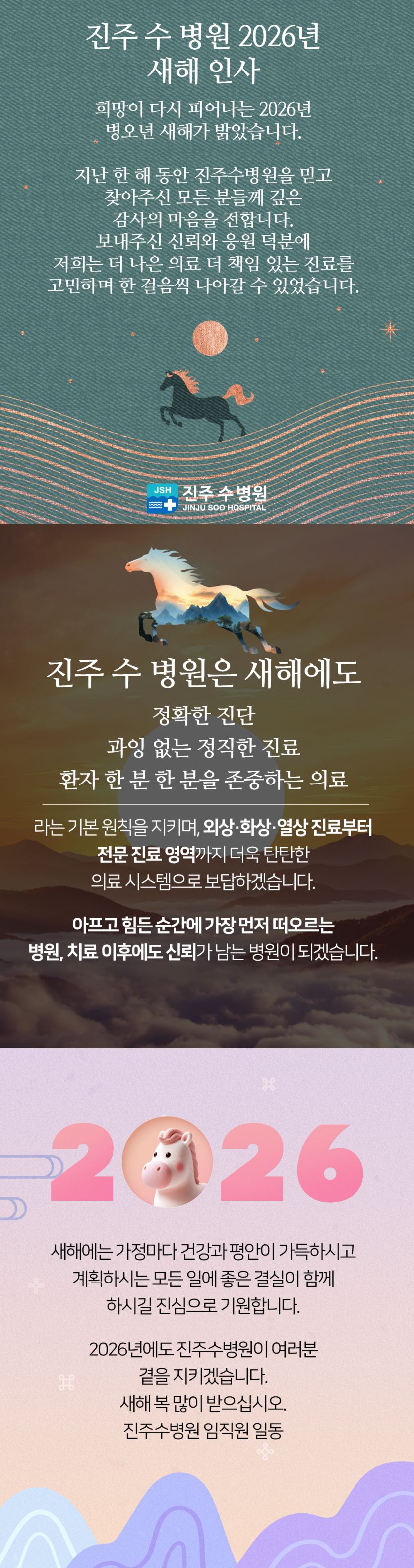 - 이전글진주 수 병원 간호 1등급 병원 충분한 간호 인력 2026.01.14