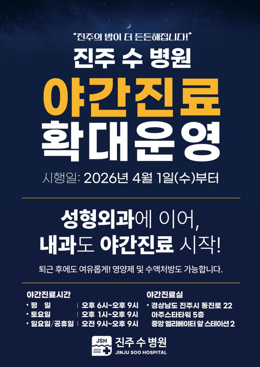 진주 수 병원이 환자분들의 편의를 위해 2026년 4월 1일부터 야간진료를 대폭 확대 운영하게 되었습니다.